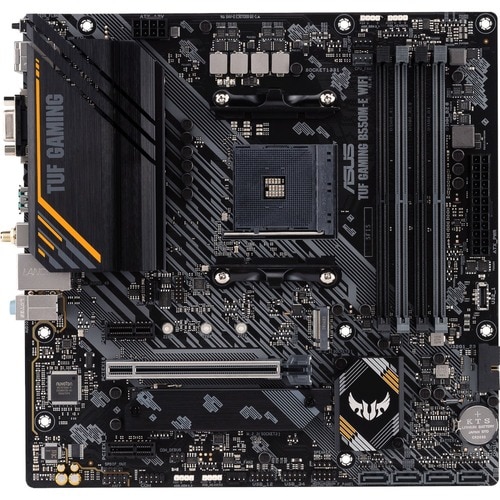 Asus TUF Gaming B550M-E WIFI Desktop Motherboard - AMD B550 Chipset - Socket AM4 - Micro ATX - Ryzen 3, Ryzen 5, Ryzen 7, Ryzen 9, Ryzen 5 Pro, Ryzen 7 PRO, Ryzen 9 PRO, Ryzen 3 PRO Processor Supported - 128 GB DDR4 SDRAM Maximum RAM - DIMM, UDIMM - 4 x Memory Slots - Gigabit Ethernet - IEEE 802.11 a/b/g/n/ac/ax - HDMI - DisplayPort - 4 x SATA Interfaces